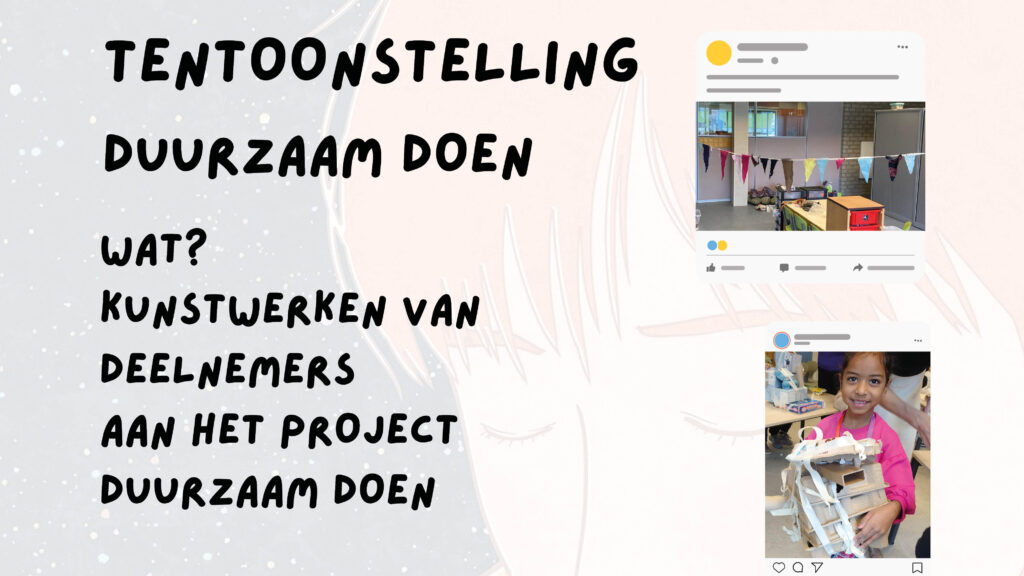 De tentoonstelling is het resultaat van wekenlang werken door leerlingen van groep 1 t/m 8 aan het project DUURZAAM DOEN, georganiseerd door De Domijnen in het kader van Cultuureducatie met Kwaliteit (CMK), onder de naam EigenWijs. Centraal staat de vraag: hoe kunnen we op een positieve en creatieve manier bijdragen aan een duurzamere wereld?