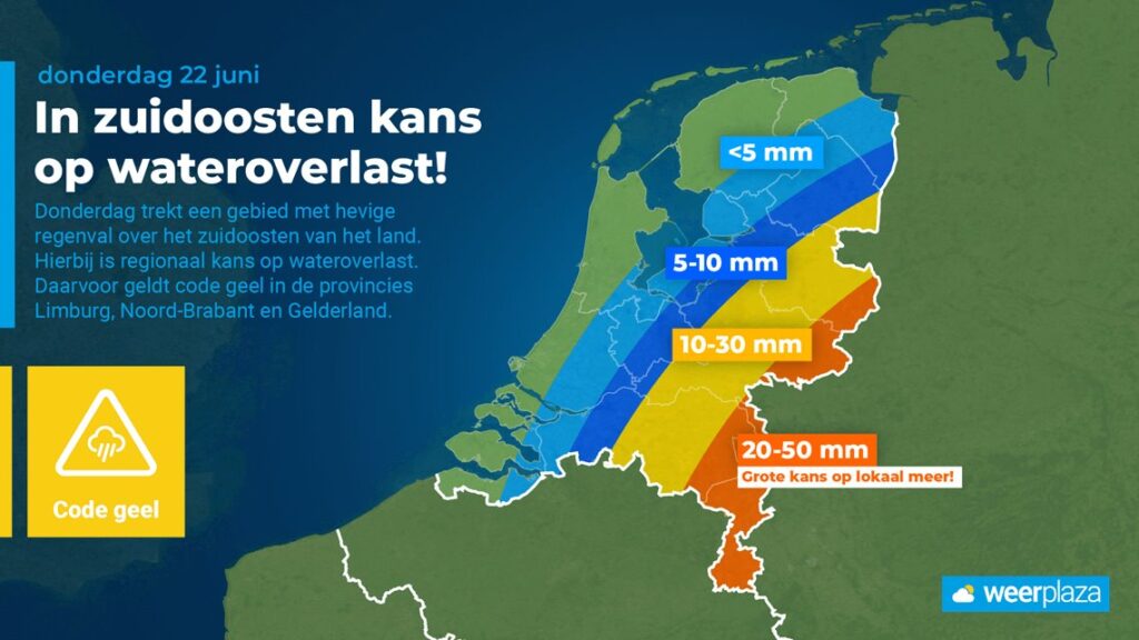 LANDGRAAF – Donderdag trekt een actief neerslaggebied langs de oostgrens van ons land met mogelijk waterlast in Limburg. Het KNMI heeft voor donderdag code geel uitgegeven voor Gelderland, Noord-Brabant en Limburg. Mogelijk valt er meer dan 50 mm regen.