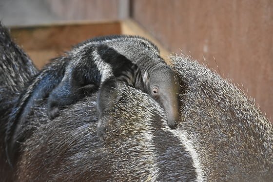 Reuzenmiereneters hebben een draagtijd van circa zes maanden. Tijdens de zomermaanden werd de buik van het vrouwtje steeds boller en accepteerde ze het mannetje niet meer in haar nabijheid. Afgelopen week zagen dierverzorgers ook kleine veranderingen in haar gedrag. Donderdag 1 september at ze de hele dag niet en vrijdag was ze erg onrustig en de dierverzorgers konden duidelijk weeën zien. Om haar goed in de gaten te houden, werd een webcam in het miereneterverblijf geïnstalleerd. De webcambeelden toonden zaterdagochtend dat niet het snuitje, maar het staartje van het jong uit het geboortekanaal stak. Het jong bleek in stuitligging te liggen. Daarom werd in allerijl de dierenarts gebeld. Toen die arriveerde kwam het kleintje toch ineens op natuurlijke wijze ter wereld.