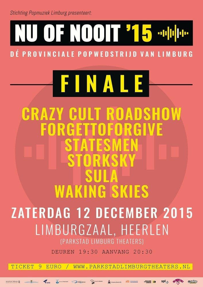 Zaterdagavond 12 december weten we wie Nu of Nooit 2015 wint. De finale vindt op die dag plaats in de Limburgzaal van het Parkstad Limburg Theater in Heerlen. Tickets zijn te koop via de website van Parkstad Limburg Theater Heerlen: www.parkstadlimburgtheaters.nl.