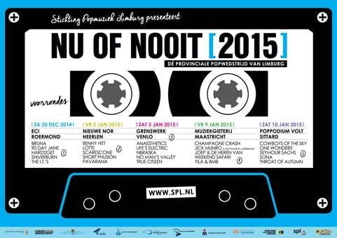 Zaterdagavond 21 februari weten we wie Nu of Nooit 2015 wint. De finale vindt op die dag plaats in Muziekcentrum de Bosuil te Weert. Tickets zijn te koop via de website van Muziekcentrum de Bosuil. Wanneer je ook in de voorronde een ticket gekocht hebt krijg je 2 euro korting op je finaleticket! Finale Nu of Nooit 2015 Datum: Zaterdag 21 februari 2015 Locatie: Muziekcentrum de Bosuil, Weert Deur: 19:30 u. / Aanvang: 20:30 u. / Entree: €9,-.