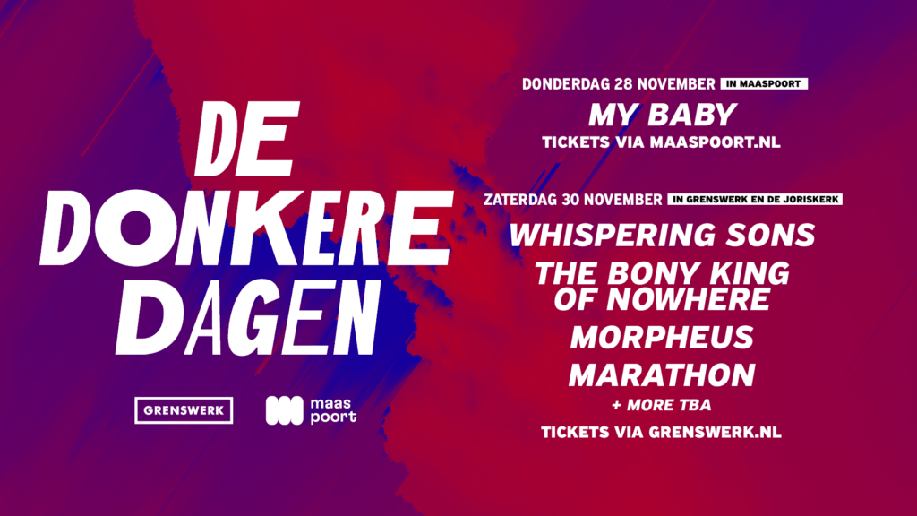 VENLO – Poppodium Grenswerk en De Maaspoort maken in november een doorstart met het festival De Donkere Dagen. Dit festival werd oorspronkelijk bedacht, gelanceerd en weer afgelast tijdens corona. Met deze frisse start pakken beide podia dit indoor festival weer op. Gedurende drie dagen spelen er artiesten in zowel Maaspoort als Grenswerk. Headliners van het festival zijn Whispering Sons, MY BABY en The Bony King of Nowhere. Verder spelen onder andere Marathon en Morpheus. Meer programma wordt later bekend gemaakt. Tickets zijn in de verkoop via grenswerk.nl en maaspoort.nl.