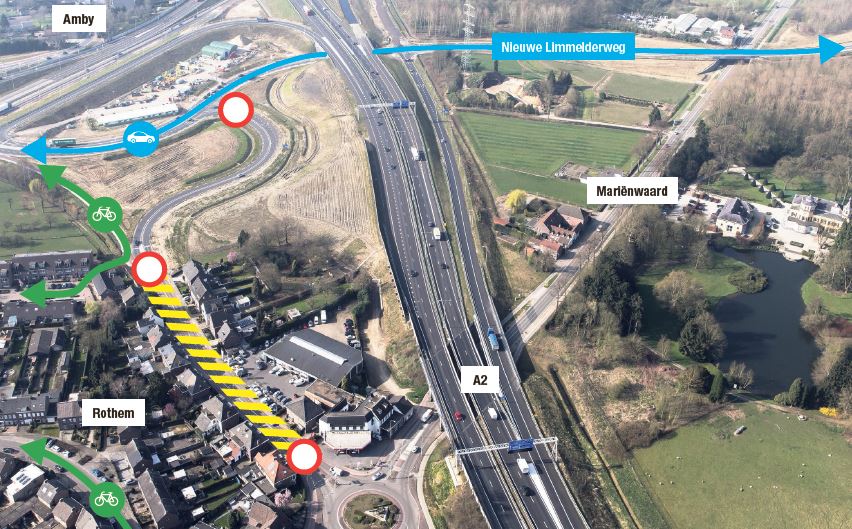 MAASTRICHT – Van 14 september tot aan kerst is de Ambyerweg tussen de rotonde bij Rothem en de Nieuwe Limmelderweg afgesloten voor verkeer. De rotonde blijft altijd toegankelijk. Ook bedrijven en winkels in de omgeving, waaronder autobedrijf Ploemen en tankstation Avia aan de Ambyerweg, zijn steeds bereikbaar.