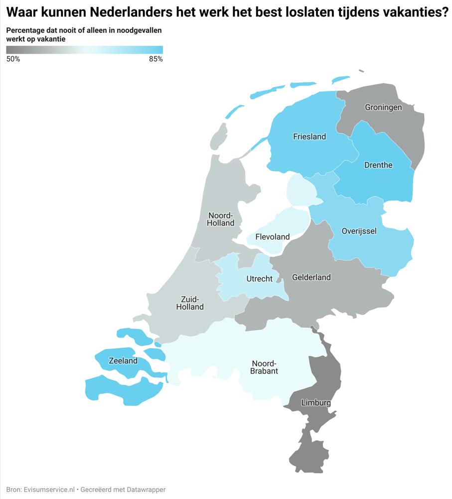 De verschillen tussen de twaalf provincies zijn aanzienlijk. Zo kunnen Limburgers het werk duidelijk het slechtst loslaten: 49 procent van hen werkt door op vakantie en bijna 9 procent zelfs iedere dag. Ook Gelderlanders en Groningers zitten met enige regelmaat achter hun werklaptop. Voor het gros van de Drenten, Friezen en Zeeuwen daarentegen is vakantie echt vakantie. Slechts twee op de tien mensen uit deze provincies werken op vakantie door.