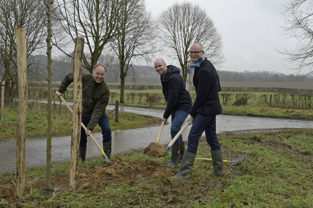 Wilfred Alblas [Het Limburgs Landschap], wethouder Tim Weijers [gemeente Kerkrade] en gedeputeerde Hubert Mackus [Provincie Limburg] verzorgen de eerste aanplant van een laan met fladderiepen om daarmee het startsein te geven voor een groene opwaardering van de Anstelvallei bij Kerkrade.