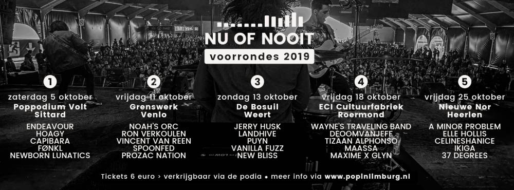 ROERMOND – Vanaf zaterdag 5 oktober a.s. vinden de voorrondes van dé provinciale popwedstrijd Nu of Nooit plaats. Vanaf die avond strijden vijfentwintig popacts verspreid over vijf voorrondes in de gemeentes Weert, Venlo, Sittard-Geleen, Heerlen en Roermond om een plek in de Nu of Nooit finale! Ook krijgen alle acts zowel muzikale als zakelijk coaching door professionals uit de Nederlandse muziekindustrie.