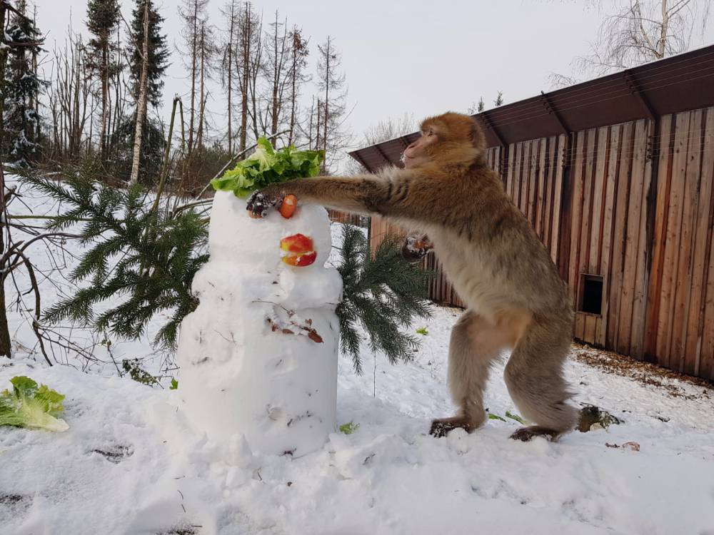 In GaiaZOO wordt de sneeuw gebruikt als instrument voor verrijking. Zo kregen zowel de boshonden, de veelvraten en de wolapen een bijzondere emmer met sneeuw gepresenteerd. In de emmer zat namelijk eten verstopt. Doordat de dieren moeite moeten doen om bij hun voedsel te komen, blijven ze extra lang bezig. Voor de berberapen hadden de dierverzorgers een andere verrassing in petto. Voor hen werd een echte sneeuwpop gemaakt. Voor de dieren fijn in het kader van verrijking, en ook nog eens leuk voor de bezoekers om naar te kijken.